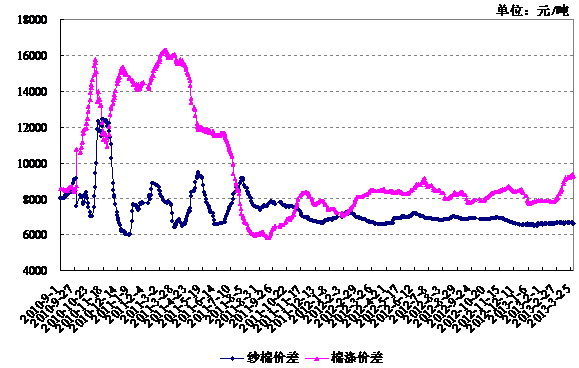 2010年度以来国内纱棉价差和棉涤价差走势对比图