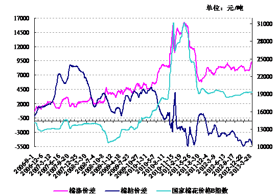 财政加大粮油储备投入,国内棉价保持平稳。本周,财政部公布2013年中央财政预算。其中,中央本级支出的粮油物资储备事务预算支出为855.6亿元,同比增长32.6%,增幅同比扩大1.6个百分点。在中央财政投入稳固支撑下,临时收储作为保障粮食生产所需的应急措施,对维护市场稳定、引导粮食生产起到积极作用。基本面上,纺织企业3月份接单与出货量出现季节性回升,其中大型企业和有进口配额的企业经营情况相对较好,纱布出厂价格小幅上调后,利润较前期有所改善。近期国际棉价上涨导致内外棉价差收窄,周边国家价格竞争优势有所削弱,企业看好4月份出货量进一步增长。政策方面,2012年度临时收储结束后,将增加2012年度新棉和进口棉的投放,保证棉花储得进、调得出、用得上。同时,为保持优势产棉区面积基本稳定、稳定市场预期,2013年国家将继续实施临时收储。鉴于当前国家棉花储备充足,市场调节更加灵活和有针对性,预计国内棉花市场整体运行仍将延续平稳格局。此外,各主产棉区播种工作已陆续展开,对各地天气变化予以关注。