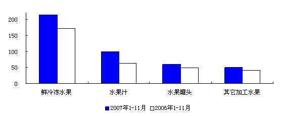 2006、2007年1-11月我国水果出口情况(单位:万吨)