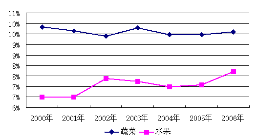 随着我国居民收入的增加以及对食物营养和健康意识的增强,水果在我国城镇居民家庭食品消费性支出中的份额也在提高。2006年城镇居民水果消费支出达到240.15元/人,占食品消费性支出的7.72%,较1995年增长1.37个百分点。预计2007年城镇居民水果消费支出占食品消费性支出的比重将有所提高。