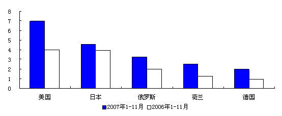 2006、2007年1-11月我国水果出口分国别(单位:亿美元)