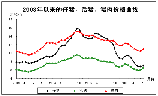 后期生猪产品价格仍将小幅上涨。本月生猪产品价格全部小幅回升,止住了连续21个月的下跌趋势,但仍处于历史的较低价位。今年1-7月份仔猪、活猪和猪肉平均价格分别为8.04元,6.56元和11.39元,同比分别下降42.1%、21.8%和16.5%。农户养猪仍处于亏损状态,平均每头商品猪亏损80元左右,养猪积极性受到一定影响,生猪存栏有所减少。另外,玉米价格的上涨推动养殖成本进一步上升,预计后期生猪价格仍将小幅上涨。