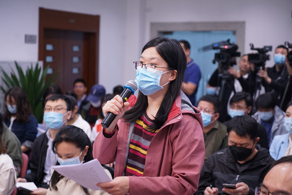 农业农村部于4月20日(周二)上午在部新闻发布厅举行新闻发布会,介绍一季度农业农村经济运行情况,并答记者问。图为光明日报记者提问。农业农村部网站 冯嘉宇摄