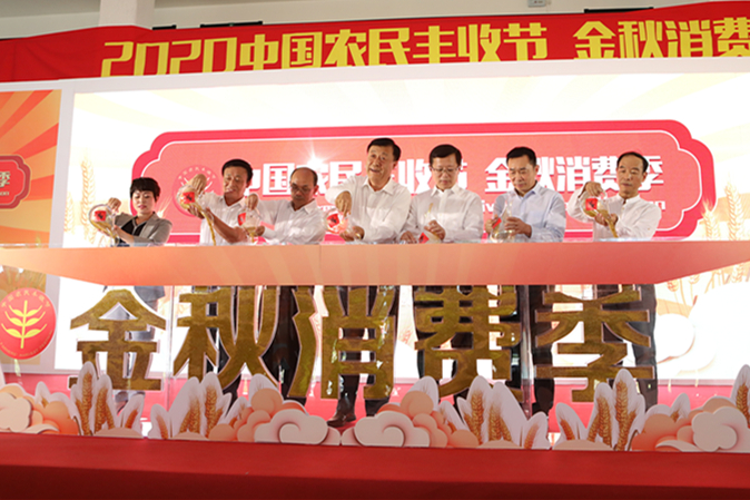 本网讯 9月7日,由农业农村部、中央广播电视总台、中华全国供销合作总社联合发起的2020年中国农民丰收节金秋消费季在北京启动。农业农村部副部长于康震、中央广播电视总台副台长蒋希伟、中华全国供销合作总社理事会副主任邹天敬,与三位农民代表共同开启“丰收门”。