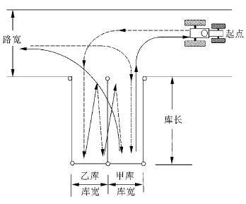 采用实物挂接或者设置挂接点的方法进行,从起点前进,一次完成倒进机库,允许再一进一倒挂上农具。