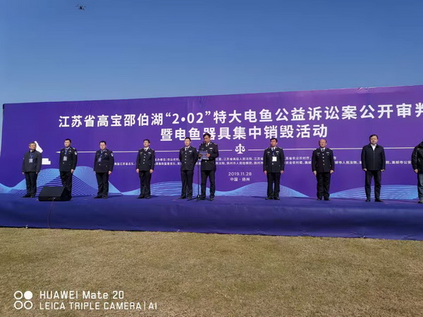 2019年11月28日,农业农村部长江流域渔政监督管理办公室联合江苏省高级人民法院、人民检察院、农业农村厅和扬州市人民政府,在扬州组织开展了“2.02”特大电鱼公益诉讼案宣判活动,并现场组织放流鲢鳙鱼、草鱼等约500万尾,集中销毁电鱼器具、非法捕捞网具1000余(套)顶。长江流域各地公安、海事、渔业主管部门和渔民代表共100余人参加。
