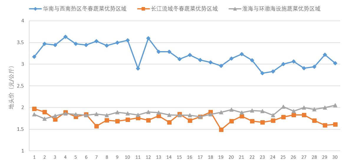 从区域看,夏秋蔬菜优势区蔬菜已基本下市,冬春蔬菜优势区蔬菜集中上市。黄土高原、云贵高原、北部高纬度等夏秋蔬菜优势区域露地蔬菜已基本下市,其中白菜、萝卜等耐储蔬菜已入窖。华南与西南热区冬春蔬菜优势区域番茄、黄瓜等茄果类蔬菜陆续上市,随着上市量大幅增加,地头价呈现下跌趋势;长江流域冬春蔬菜优势区域露地蔬菜、设施蔬菜集中上市,价格走势平稳;黄淮海与环渤海设施蔬菜优势区域冬储蔬菜供应量充足,设施蔬菜地头价呈现上涨趋势。