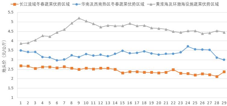 从区域看,各冬春蔬菜优势区域间价格差异明显。黄淮海与环渤海设施蔬菜优势区域,月均价4.59元/公斤,环比下降4.38%。山东、河南、河北、安徽等地采取封路封村等管控措施较早,蔬菜流通受阻,1月末地头价大幅下降。随着保障措施陆续出台,2月上旬地头价快速回升,中下旬趋于稳定。华南与西南热区冬春蔬菜优势区域,月均价3.31元/公斤,环比下降2.36%,月内价格先降后升,受封路封村措施影响,2月初华南与西南地区蔬菜地头价出现小幅下降,之后缓慢回升。长江流域冬春蔬菜优势区域,月均价2.43元/公斤,环比上升1.67%,该地区疫情发生较早,产地蔬菜多为就近供应,月内价格基本稳定,14日后出现小幅下降,月末又有所回升。