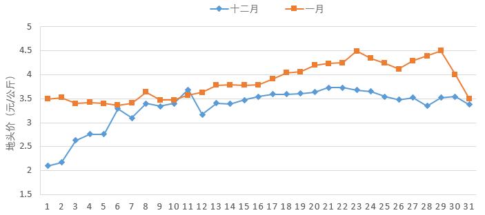 从全国看,1月地头价呈季节性上涨,春节期间波动较大。1月,受春节消费拉动、节日用工紧张等因素影响,春节前期蔬菜地头价呈季节性持续上涨。春节期间,蔬菜价格波动较大。主要表现为“先落后涨再跌”:“先落”,除夕至26日,因节前囤货量较大,市场需求量减少,加之市场经纪人回家过年,蔬菜地头价开始回落。“后涨”,26日至29日,各地加大疫情防控措施宣传力度,居民居家隔离比例增大,蔬菜集中采购情况增加,部分地区出现暂时性抢购,拉动地头价短期上涨。“再跌”,29日之后,疫情防控措施进一步升级,许多地区为防止疫情蔓延封村封路、封停集市,市场经纪人进不了村、村里的菜流通不出去,地头价迅速下降。