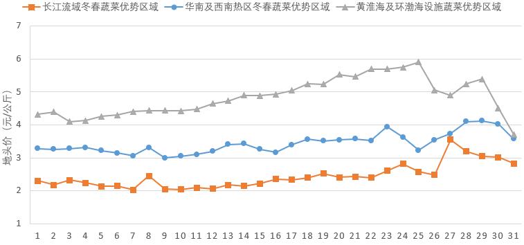 从区域看,各冬春蔬菜优势区与全国走势相一致。黄淮海与环渤海设施蔬菜优势区域正值茄果类等价格较高蔬菜集中上市,加之受日照偏少和生产成本较高等因素影响,地头价相对较高,月均价4.80元/公斤;华南与西南热区冬春蔬菜优势区域受不利天气影响较小,产量稳定,地头价相对居中,月均价3.39元/公斤;长江流域冬春蔬菜优势区域多生产叶菜类、根茎类等单产高、价格低的蔬菜,地头价相对较低,月均价2.37元/公斤。