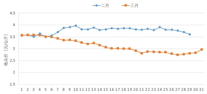 从全国看,3月份蔬菜地头价呈季节性下降趋势,同比降幅较大。主要是由于今春蔬菜生产总体稳定,供应比较充足,加之餐饮行业复工复产较为缓慢,需求尚未完全释放,导致今春蔬菜地头价整体较低。3月上中旬,蔬菜地头价持续下降,直至3月下旬,随着全国开始全面复工复产,需求有所提增,加之全国出现大范围的强降温和风雨天气,影响蔬菜生长速度,地头价下降趋缓并略有回升。