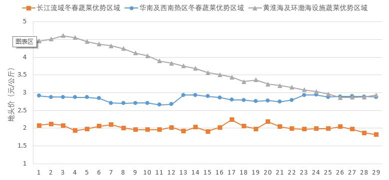 从区域看,各冬春蔬菜优势区域间价格差异明显。黄淮海与环渤海设施蔬菜优势区域,月均价3.61元/公斤,环比下降21.01%。该地区3月气温较常年偏高2—4℃,中小拱棚和塑料大棚蔬菜上市提前,并逐渐取代日光温室蔬菜,生产成本降低,月内价格下降明显。华南与西南热区冬春蔬菜优势区域,月均价2.84元/公斤,环比下降14.71%,月内价格基本稳定。长江流域冬春蔬菜优势区域,月均价2.00元/公斤,环比下降17.70%,月内价格基本稳定。