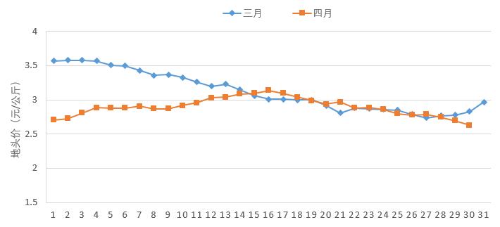 从区域看,各冬春蔬菜优势区域间价格差异明显。黄淮海与环渤海设施蔬菜优势区域,月均价2.58元/公斤,环比下降28.53%,本区域主要为设施生产茄果类蔬菜,受不良天气影响较小,由于气温回升,产量增加明显,加之疫情影响,前期库存蔬菜积压较多,供应商清空库存需求强烈。华南与西南热区冬春蔬菜优势区域,月均价3.38元/公斤,环比上涨19.01%,本区域主要是露地蔬菜,4月份降雨较多,受不良天气影响较大,且已陆续下市,供应量持续减少。长江流域冬春蔬菜优势区域,月均价2.86元/公斤,环比上涨43.00%,本区域受不良天气和供应量减少影响,上旬地头价上升,下旬已近收获尾声,品质下降,地头价开始下降。