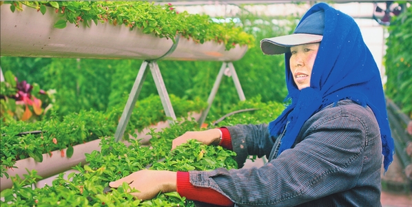 图为庄玉玲在整理滴灌设备。