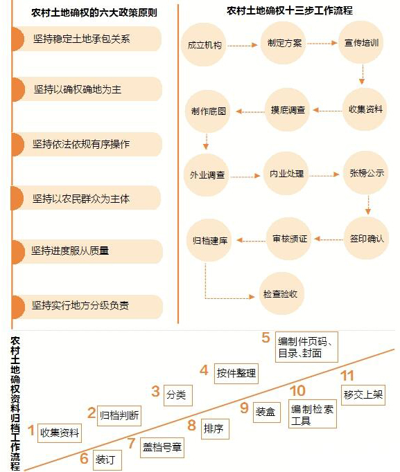 同时,制定了确权登记颁证问题解答、确权档案整理规则、确权资料归档工作流程、确权数据库建设技术指南、数据库成果汇交办法、确权登记颁证检查验收细则等一系列技术文件。
