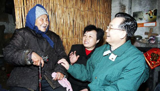在五里墩村,温家宝握着80多岁的五保户老人郭秀兰的手,问她年夜饭准备好了没有,郭秀兰说村里送来了各种年货,饺子也包好了。温家宝说,你吃上饺子我就放心了。他坐在老人跟前问:“这屋里有点凉,你晚上睡觉冷不冷?自己做饭吗?”郭秀兰说:“不冷。村里有人来帮着做饭,挺好的。你今天来看我,我心里可欢喜呢。”温家宝还不放心,他摸了摸老人穿的棉衣,又走到老人的床前,看被褥是不是暖和。他叮嘱村里的干部:老人年纪大了,要在厕所里准备个便桶,晚上要有个便盆。