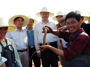 5月23日下午,农业部部长杜青林、副部长危朝安在江西省人民政府副省长熊盛文、农业厅党委书记萧茂普、厅长毛惠忠、副厅长张忠平等的陪同下,考察了余干县瑞洪镇镇郊村的3000亩乌鱼(黄鳝)特色养殖基地。农业部渔业局局长李健华等农业部有关司局的领导一同考察。