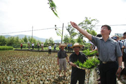 在示范现场,范小建望着田间农民轻松抛秧的情景,兴致勃勃。他向农民询问抛秧的技巧,并亲自体验抛秧的快乐。