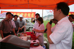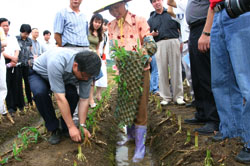 到达现场的时候,正值农民在田间免耕移栽玉米苗。范小建顶着骄阳,卷着裤脚,到田地里与农民一起种苗劳作,他还不时地向他们了解当地玉米免耕栽培种植情况。当他得知村里采用免耕栽培技术后,玉米种植已经由一年两季发展到一年三季,亩纯收入达到2500元时非常高兴,并对这项技术给农民带来的实惠感到欣慰。
