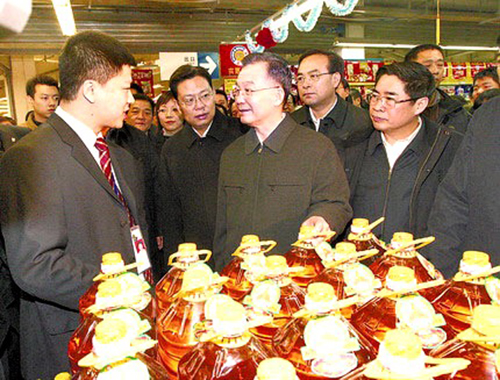 12月29日,中共中央政治局常委、国务院总理温家宝在省委书记赵乐际、省长袁纯清等陪同下,在西安市阎良区爱家购物广场询问并仔细察看食用油、猪肉等副食品价格。陕西日报记者 宋红梅摄