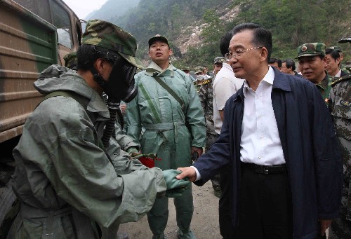 面对正在进行卫生消毒的武警官兵,温家宝勉励大家说,在安置受灾群众的过程中,人民解放军和武警官兵要继续发挥突击队的作用,发扬不怕艰苦、不怕疲劳、连续作战的作风,继续为人民做出新的贡献。