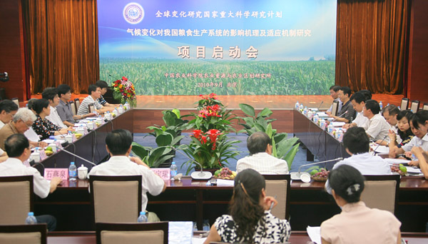 9月7日,中国农业科学院联合中国农业大学、南京大学、中国科学院遗传发育所等国内优势单位,启动了气候变化对我国粮食生产系统的影响机理及适应机制研究项目。该项目将紧紧围绕气候变化与我国粮食生产系统之间的关系,针对我国应对气候变化、稳定粮食生产、确保粮食安全、促进粮食主产区农村经济社会发展和农民增收的国家重大需求,重点解决气候变化背景下资源要素(水分、热量、土壤肥力和作物品种)时空变化对粮食生产系统的影响机理及适应机制以及生物(主要病虫害)和非生物灾害(旱灾)灾变过程、致灾成灾机理及适应机制等关键科学问题。