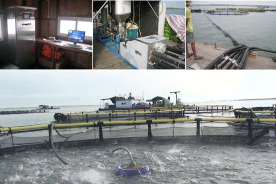 上图左:数字养殖控制系统,上图中:远程多路投饵机,上图右:系统装备与网箱互联;下图:数字养殖自动投饵现场
