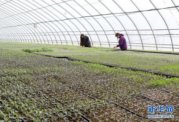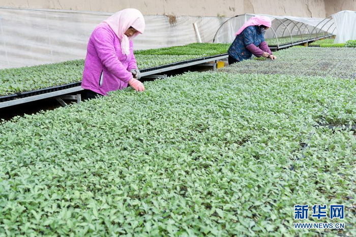 2月28日,甘肃省临夏回族自治州永靖县三塬现代农业园区的工人在管护蔬菜秧苗。