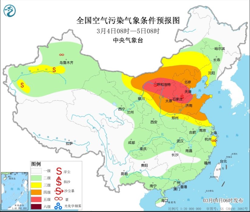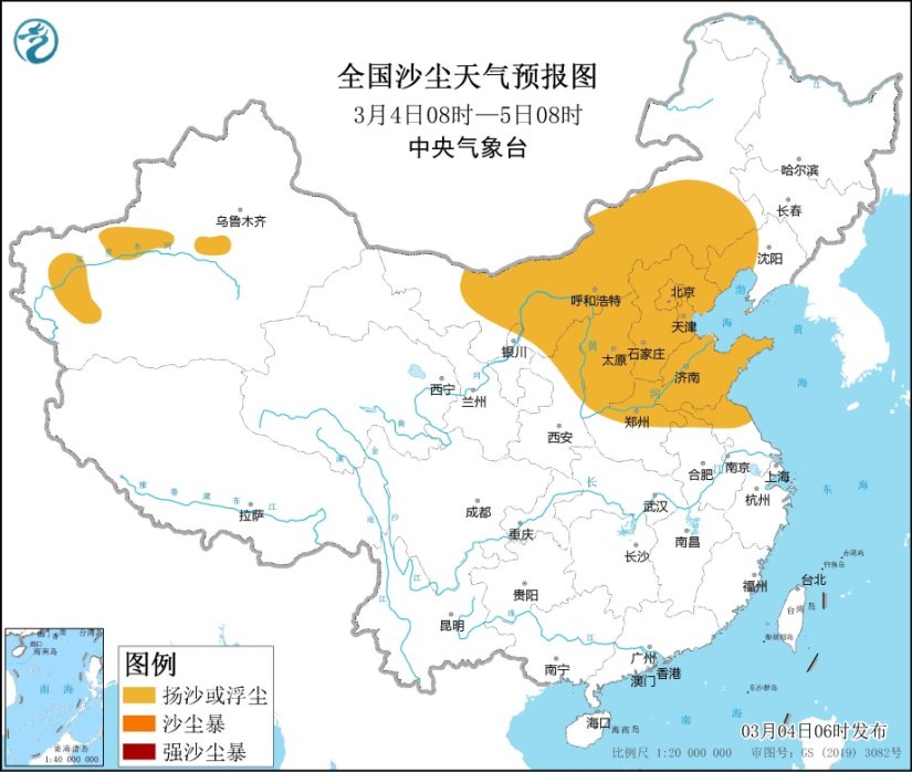 受冷空气大风影响,预计4日,内蒙古中西部、陕西北部、山西、河北、北京、天津、山东、河南北部、辽宁西部等地的部分地区先后有扬沙或浮尘天气。中央气象台于4日6时继续发布沙尘暴蓝色预警。