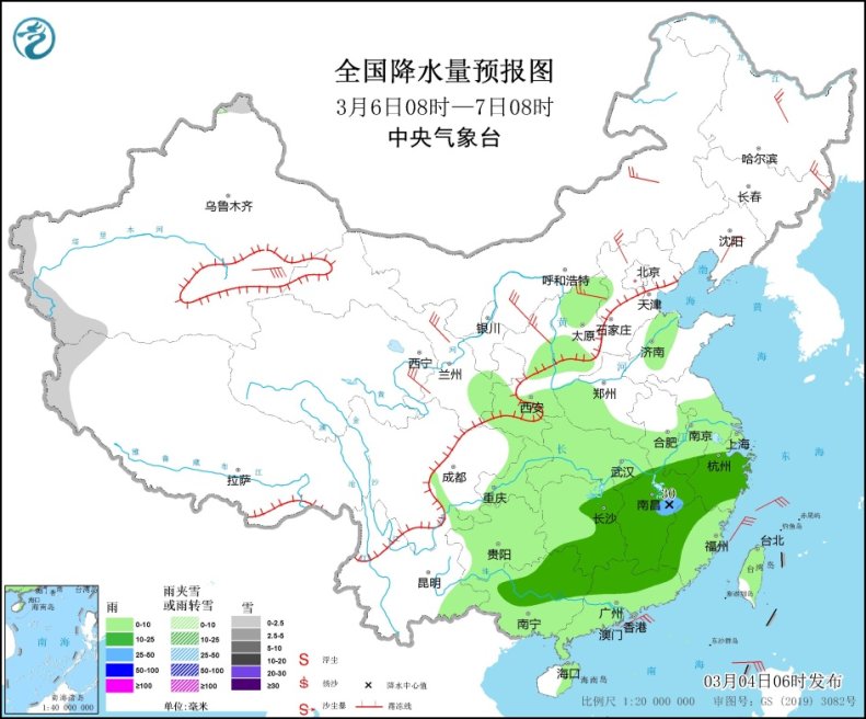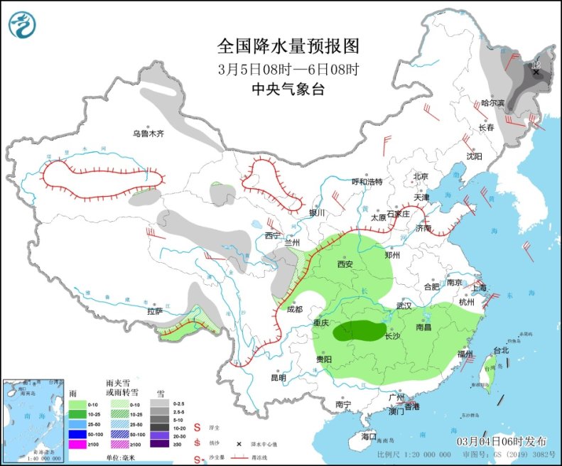 图1 全国降水量预报图(3月4日08时-5日08时)