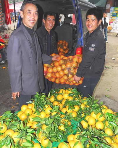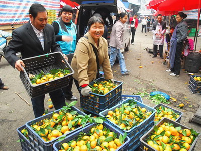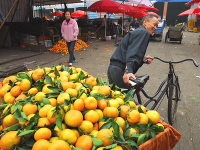 2008年10月26日,成都市驷马桥水果批发市场柑桔销售区,水果商贩正在进货准备外出零售。