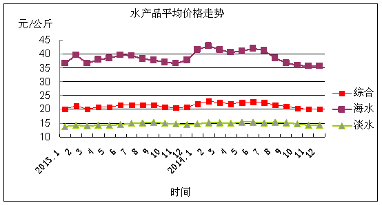 据对全国80家水产品批发市场成交价格统计,2014年水产品批发市场综合平均价格21.70元/公斤,同比上涨3.54%。其中海水产品综合平均价格39.39元/公斤,同比上涨3.81%;淡水产品综合平均价格14.96元/公斤,同比上涨2.76%。水产品市场交易总体平稳,成交量、成交额同比分别增加1.43%和0.24%。