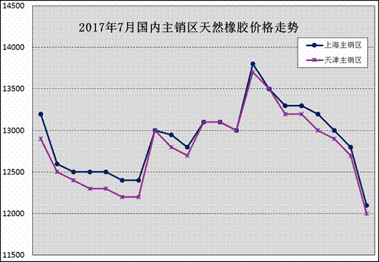 分析预测:2017年7月上中旬,受胶价低迷胶农割胶积极性不高,国内外主产区主动去产能,国外主产区连续出台严禁违法种植砍伐、严控外劳、财政支持增加橡胶使用量等保价政策,国内部分轮胎企业试探性涨价,6月份重卡销售量9.5万辆,同比增长60%,创历史同期最高水平,以及青岛保税区橡胶库存见顶小幅回落等利多因素影响,国内天然橡胶市场价格震荡上扬。7月下旬,受国内外主产区橡胶供应充足,国内天然橡胶进口量连续8个月同比增长,上海期货交易所橡胶库存创历史新高,以及电路检修事件导致轮胎厂限产停产,轮胎消费处于传统淡季等利空因素影响,国内天然橡胶市场价格快速下跌。2017年8月,国内外主产区处于割胶旺季,而汽车轮胎消费仍处于淡季,轮胎厂开工率不高,加上青岛保税区和上海期货交易所库存高企,均对天然橡胶市场价格形成较大压制。如果不出现大的突发事件,综合预计2016年8月天然橡胶市场价格将在13000元/吨上下震荡。