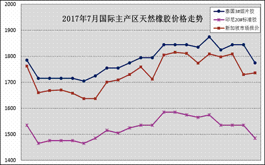 根据农业部农垦局(农业部发展南亚热带作物办公室)监测,7月,泰国3号烟片胶(RSS3)和印尼20号标准胶(SIR20)价格全月小幅震荡上扬。国内产销两地国产标准胶(SCRWF)现货价格未跟随国外走势,上中旬先跌后涨震荡上扬,下旬快速回落,成交量较上月有所增加。