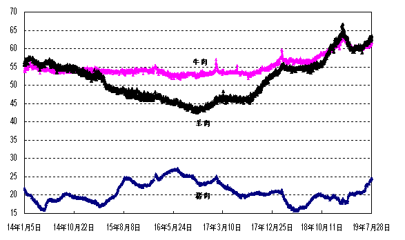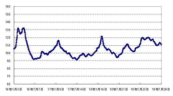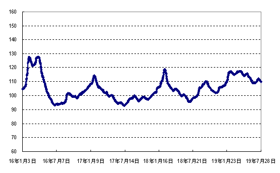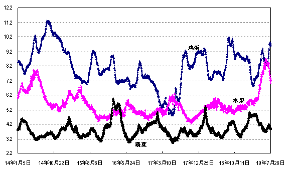 据农业农村部监测,2019年第30周(2019年7月22日-7月28日,下同)“农产品批发价格200指数”为110.37(以2015年为100),比前一周降1.13个点;“‘菜篮子’产品批发价格200指数”为111.73(以2015年为100),比前一周降1.26个点。重点监测的50家批发市场60个品种交易总量为50.21万吨,比前一周减3.7%。