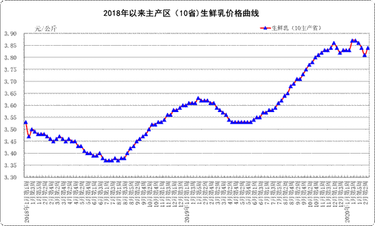生鲜乳价格。内蒙古、河北等10个奶牛主产省(区)生鲜乳平均价格3.84元/公斤,比前一周上涨0.8%,同比上涨6.1%。