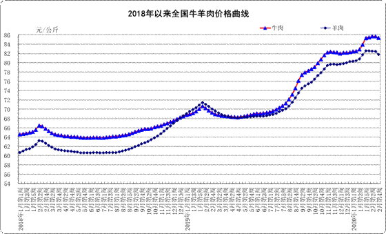 牛羊价格。全国牛肉平均价格85.33元/公斤,比前一周下降0.4%,同比上涨23.1%。河北、辽宁、吉林、山东和河南等主产省份牛肉平均价格75.97元/公斤,比前一周下降0.1%;上海、浙江、福建、广东和江苏等省份平均价格100.69元/公斤,比前一周下降0.9%。全国羊肉平均价格81.79元/公斤,比前一周下降0.8%,同比上涨16.8%。河北、内蒙古、山东、河南和新疆等主产省份羊肉平均价格77.42元/公斤,比前一周下降0.5%;上海、浙江、福建、江西和广东等省份平均价格90.42元/公斤,比前一周下降1.1%。