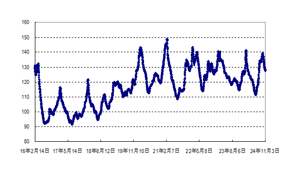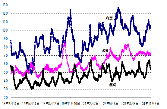 据农业农村部监测,2024年第44周(2024年10月28日—11月3日,下同)“农产品批发价格200指数”为126.33(以2015年为100),比前一周降1.31个点,同比高10.85个点;“‘菜篮子’产品批发价格指数”为128.34(以2015年为100),比前一周降1.49个点,同比高13.53个点。