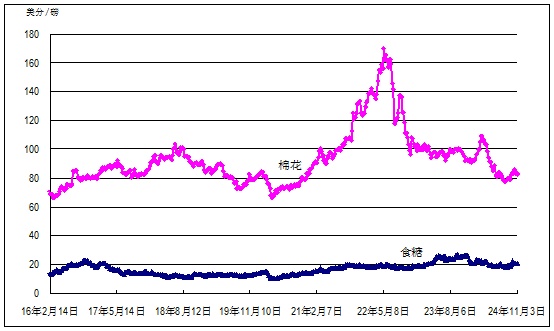 泰国100%B级和5%破碎率大米曼谷离岸周均价每吨分别为531美元和516美元,环比均跌3%,同比分别低11%和12%;国际棉花价格指数(SM级)每磅82.57美分(每吨1820美元),环比跌2%,同比低13%;美国芝加哥商品交易所大豆、小麦和玉米最近期货合约收盘周均价每吨分别为359美元、209美元和162美元,环比分别跌2%、1%和1%,同比分别低25%、高1%和低13%。