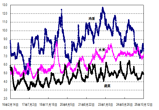 3.水产品价格涨跌互现。白鲢鱼、花鲢鱼和大带鱼批发市场周均价每公斤分别为9.70元、16.46元和41.55元,环比分别涨1.8%、1.1%和0.3%;鲤鱼、大黄花鱼、草鱼和鲫鱼批发市场周均价每公斤分别为13.95元、43.05元、17.13元和19.97元,环比分别跌2.2%、1.6%、1.4%和0.5%。