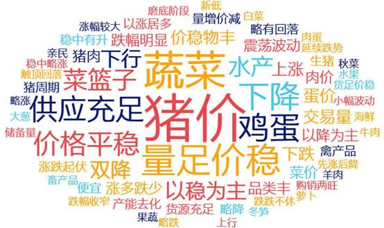 2. 蔬菜均价小幅下跌。重点监测的28种蔬菜周均价每公斤4.91元,环比跌1.2%,同比低21.3%。分品种看,17种蔬菜价格下跌,2种持平,9种上涨。其中,菜花价格跌幅较大,环比跌12.2%,西葫芦和菠菜价格环比分别跌5.6%和5.2%,其余品种价格跌幅在5%以内;胡萝卜和南瓜价格环比均基本持平;冬瓜和黄瓜价格环比分别涨4.2%和2.2%,其余品种价格涨幅在2%以内。
