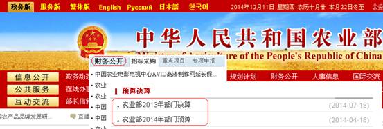 六是财政资金信息公开。及时将2014年部门预算和2013年部门决算在门户网站财务公开专栏公开,并在《农民日报》刊发消息。将所有预决算科目公开至项级科目,同时公开了部门职责、机构设置、数据增减变化情况说明,并对专业性较强的名词进行解释。加大“三公”经费公开力度,在部门预算中,向社会公开了2014年“三公”经费预算数、2013年“三公”经费预算数和2013年“三公”经费执行数,对增减变化进行了说明,并增加公开了我部相关“三公”经费预算数和执行数;在部门决算中,向社会公开了2013年度“三公”经费决算总额和各分项数额,对与预算数增减的原因进行了说明,并对包括“三公”经费名词解释及相关的公务用车购置数及保有量、因公出国(境)团组数及人次数、公务接待等有关情况说明。按照审计工作统一部署,通过审计署网站公开了我部2013年度预算执行和其他财政收支情况审计结果以及审计整改的有关情况等。落实并探索财政资金信息公开,建立了农业科研项目管理信息公开制度,除涉密及法律法规另有规定外,向社会和单位内部公开农业科研项目的立项信息、研究成果、资金安排情况等。