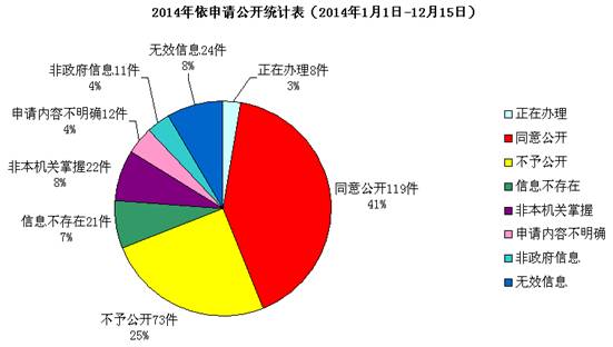 二是认真做好依申请公开工作。截至12月15日,共收到信息公开申请290件,全部按时予以答复。针对情况复杂的公开申请,建立会商机制,依法依规满足人民群众的特殊信息需求。着手对农业部门户网站信息公开专栏进行改进,将“公开申请”由单一的网上申请页面升级为集“申请须知”“办理流程”“网上申请”“进度查询”“受理机构”和“申请表下载”为一体的信息系统,为申请人提供更便捷的服务。