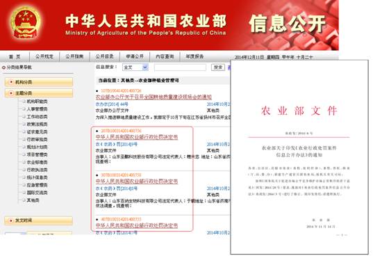 三是农产品质量安全信息公开情况。2014年,我部共组织开展了4次农产品质量安全例行监测工作,前3次例行监测结果已经及时向社会公开发布,第四次例行监测结果计划于年底向社会公布。修订并颁布了《农产品质量安全突发事件应急预案》,从制度建设上提高应对农产品质量安全事故的能力,保证信息发布及时、准确,维护公众知情权。颁布实施了《食品中农药最大残留限量》国家标准(GB2763-2014)等250余项农业标准,其中重要标准通过人民日报、新华社等主流媒体进行了报道和宣传,全部标准在农业部网站和中国农业质量标准网等网站上主动公开,供社会公众免费查询。印发了《农业行政处罚案件信息公开办法》,推动地方加大按照一般程序依法查办的行政处罚案件相关信息的公开力度,截至10月底,全国农业系统已对363起做出行政处罚的制售假冒伪劣农资案件依法进行了信息公开。在食品安全宣传周期间,结合当前农产品质量安全生产和消费领域的热点问题,邀请有关专家进行科普解读,编制出版了《农产品质量安全生产消费指南(2014版)》。