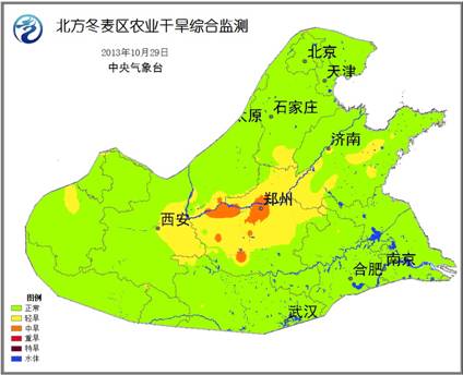 截至10月29日农业干旱监测结果表明:甘肃陇中、陕西关中东部、山西西南部、河南中北部、河北南部、山东西部存在轻至中度农业干旱。