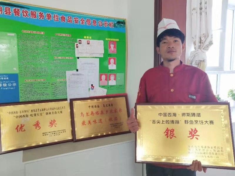 农家乐占地1800平方米,特色的各种烤鱼、农家散养的土鸡、还有博斯腾湖最有名气的五道黑,还有博湖出口的日本贡鱼等,各种鱼宴美食,很多吃过这家美食的游客对一道河菜品味道、价钱等各方面都给予高度的评价。农家乐有丰富的蔬菜瓜果采摘园,游客用餐结束还可以去采摘园免费采摘,有宽敞的停车场和干净整洁的包厢大厅。因为菜好吃,一个星期的时间,他的农家乐接待游客已经达上百人,他非常看好这里的发展前景,对自己的选择充满了自信。