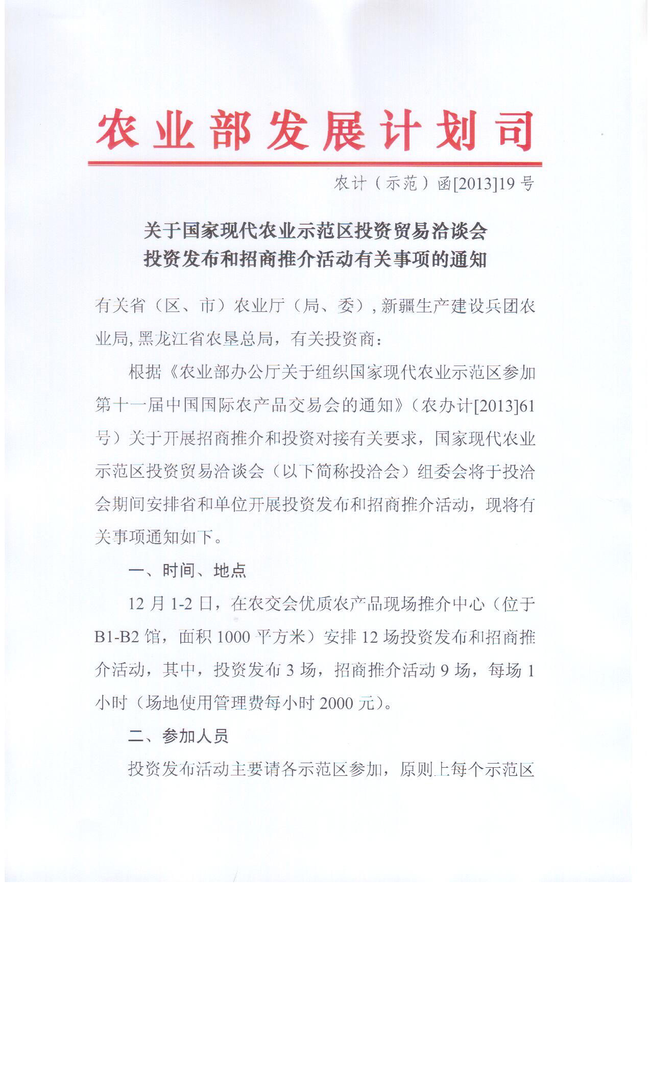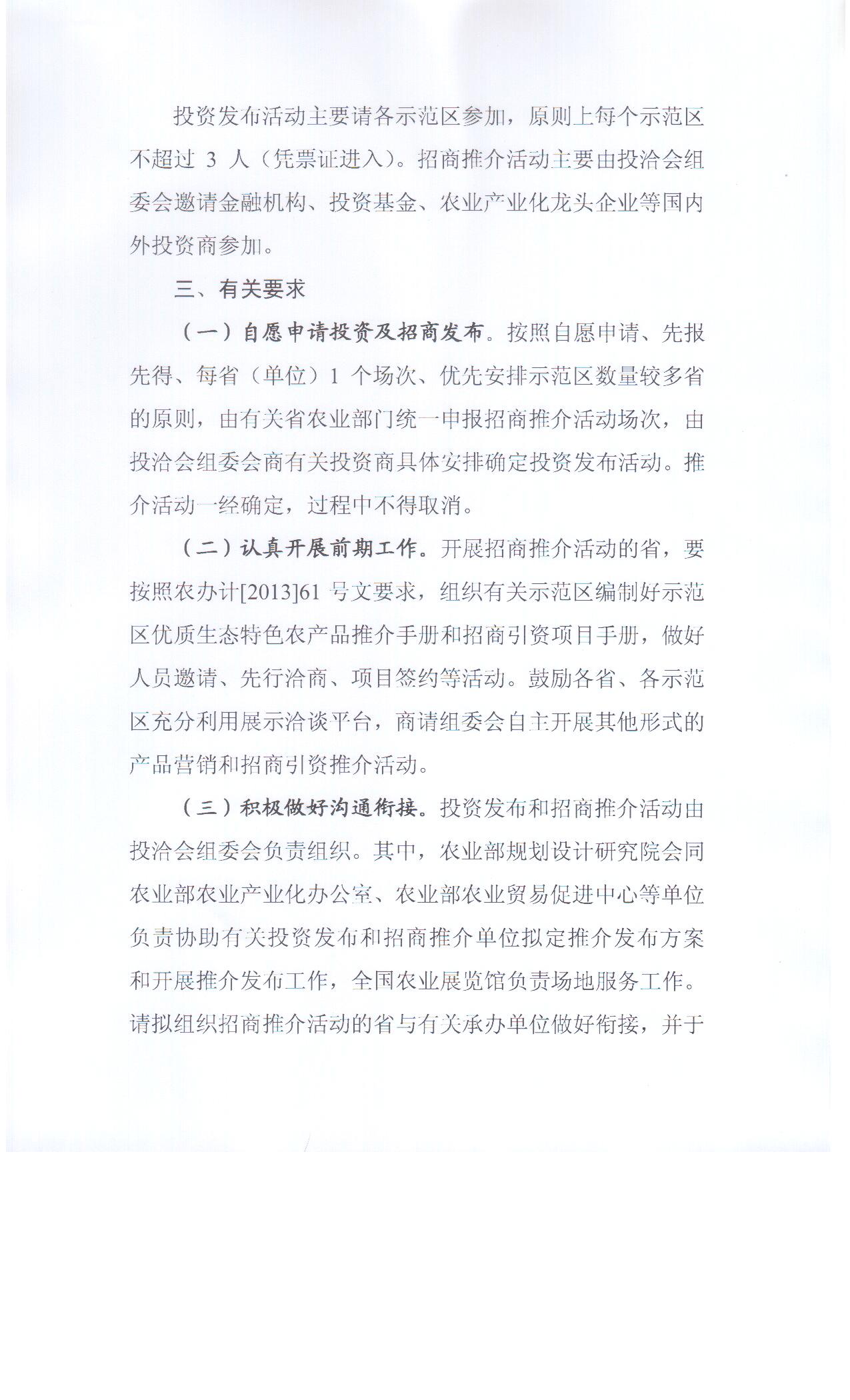 根据《农业部办公厅关于组织国家现代农业示范区参加第十一届中国国际农产品交易会的通知》(农办计[2013]61号)关于开展招商推介和投资对接有关要求,国家现代农业示范区投资贸易洽谈会(以下简称投洽会)组委会将于投洽会期间安排省和单位开展投资发布和招商推介活动,现将有关事项通知如下。
