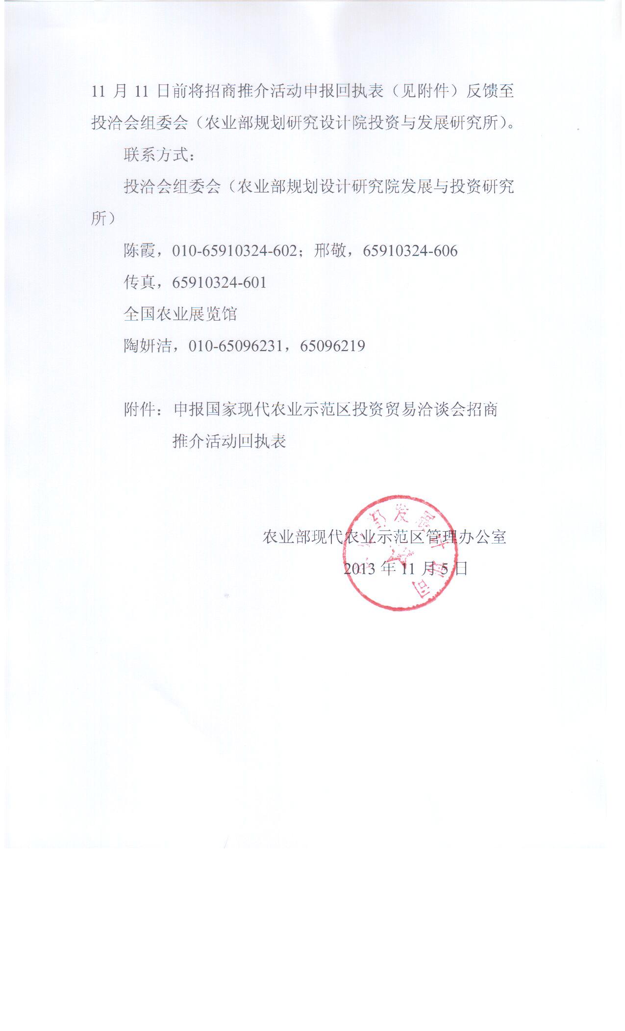 (三)积极做好沟通衔接。投资发布和招商推介活动由投洽会组委会负责组织。其中,农业部规划设计研究院会同农业部农业产业化办公室、农业部农业贸易促进中心等单位负责协助有关投资发布和招商推介单位拟定推介发布方案和开展推介发布工作,全国农业展览馆负责场地服务工作。请拟组织招商推介活动的省与有关承办单位做好衔接,并于11月11日前将招商推介活动申报回执表(见附件)反馈至投洽会组委会(农业部规划研究设计院投资与发展研究所)。