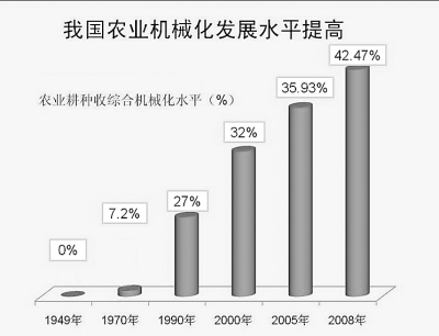 新中国成立之初,我国人均占有209公斤原粮,有钱人多吃一口,很多人就要饿肚子。1949年以来,我国粮食生产先后登上了3000亿斤、6000亿斤、8000亿斤、10000亿斤几大台阶。同时,经济作物生产协调发展。2008年全国棉花总产量达到749万吨,比1949年的44万吨增长了16倍;油料总产2952.8万吨,糖料总产13419.6万吨,分别比1949年增长了10.5倍和46.3倍。2004—2008年,粮食连续5年增产,2009年实现夏粮连续6年增产,为经济社会平稳较快发展和应对各种困难局面奠定了基础。
