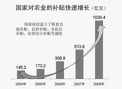 2004年开始,先后对种粮农民实施了直接补贴、良种补贴、农机具补贴、农业生产资料综合直补政策。2009年,“四补贴”金额已达到1230亿元。一减一加,农民得到巨大实惠。